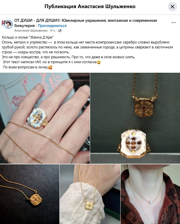 Возможно, для карточки товара этот текст и не годится, в карточке указывают "полезные" свойства товаров, а здесь скорее эмоциональная оценка и презентация украшений. Но в соцсетях такой стиль текста уместен и хорош. Нам понравился текст и описание, мы решили поделиться с вами: " Кольцо и колье "Жанна Д’Арк"